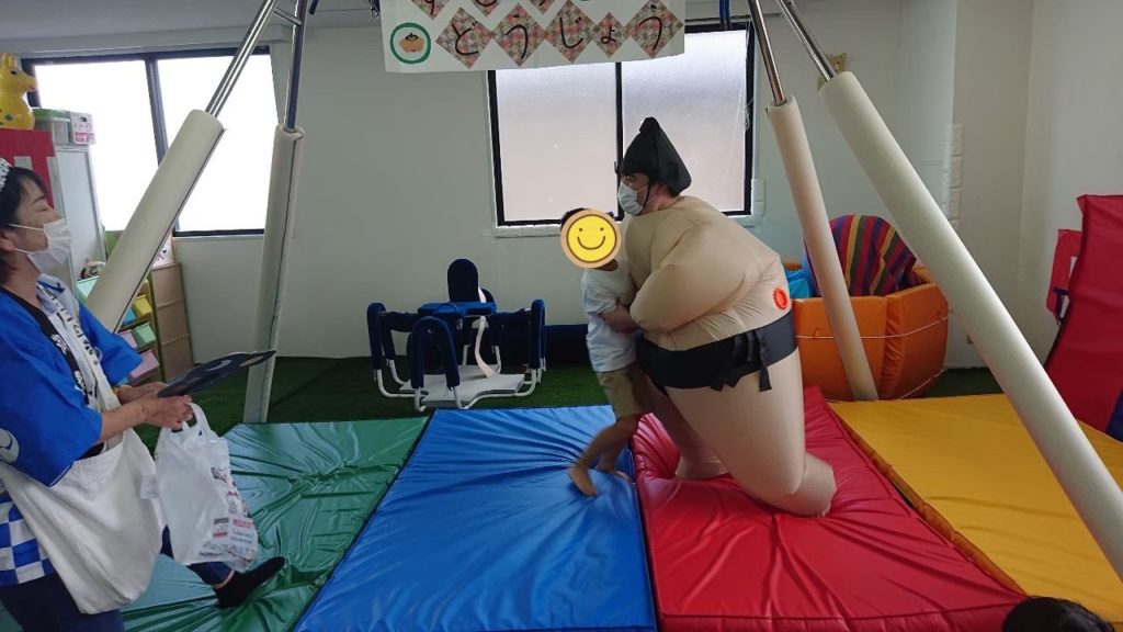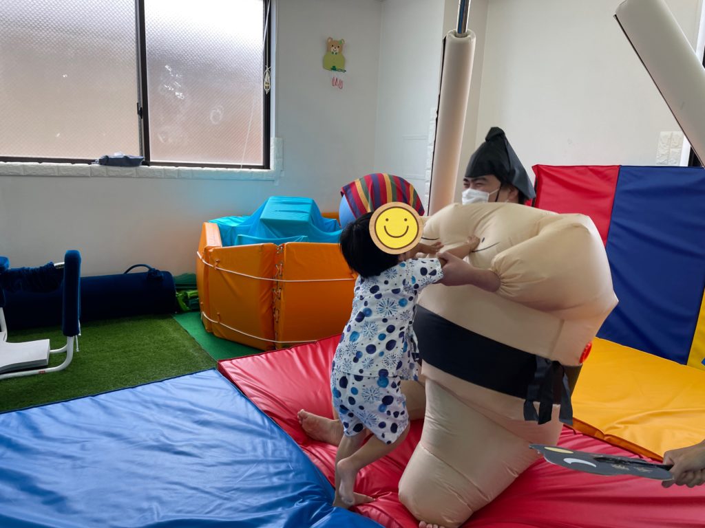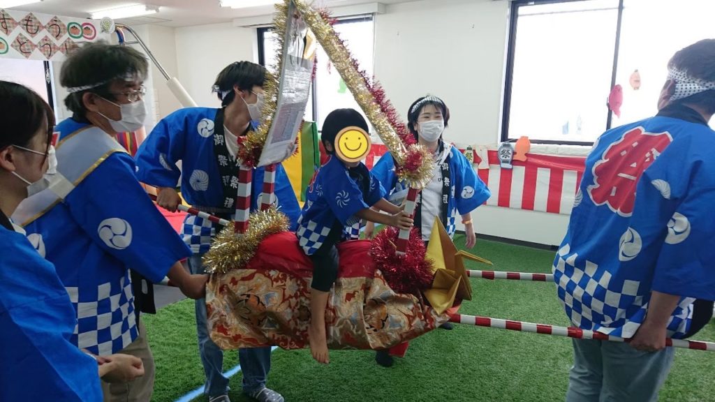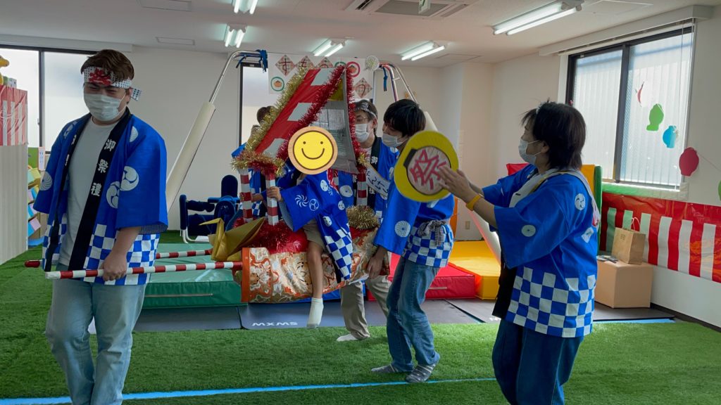 お祭りの最後は、『びりーぶ』特製お神輿に一人ずつ乗りました。法被を着て、「♪びりーぶ びりーぶ わっしょいわっしょい 元気に 元気にわっしょい わっしょい♪」の掛け声に合わせて、『びりーぶ』の部屋を一周しました。お神輿に初めて乗るこども達は少しドキドキしたり、揺れを楽しんだりしていました。