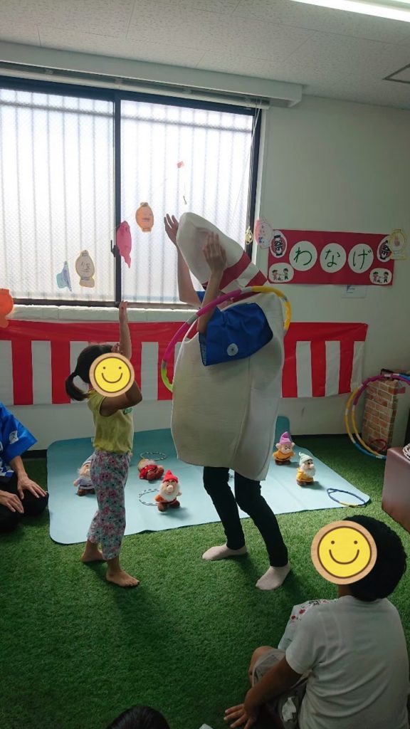 人形に向かって、輪を勢いよく「えいっ」と投げました。一つの人形に狙いを定めて投げている様子が見られ、友達が投げていると「頑張れ!」と応援していました。最後は特大の輪を、ピン子ちゃんに向かって投げました。ピン子ちゃんに輪が入ると、素敵な商品をゲットできて、みんなとっても嬉しそうでした。